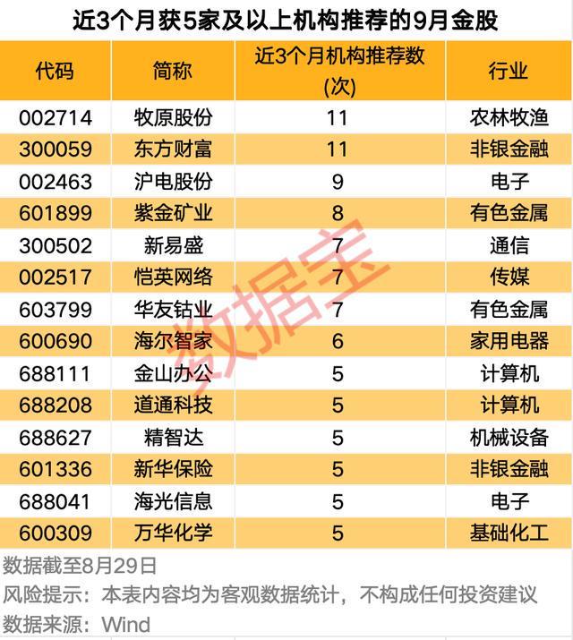 从近3个月推荐次数来看,9月金股中,超半数获2家及以上机构推荐为热门金股,牧原股份、东方财富、沪电股份、金山办公等14股获5家及以上机构推荐。
