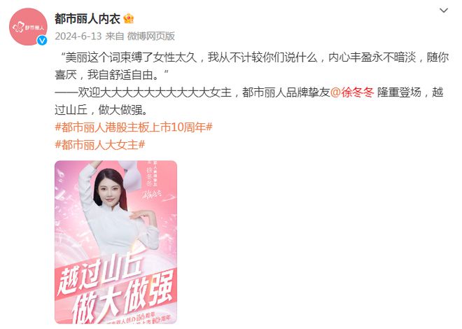 为了配合产品和市场的转型,都市丽人签下了更接地气、也更侧重健康审美的徐冬冬作代言人,并在大量城市、县城、镇上的主要公共汽车亭、高铁站大屏等渠道投放广告。