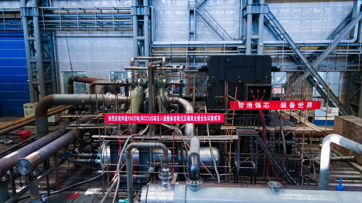 沈鼓集团承接了该项目核心动设备——二氧化碳压缩机的研制任务。根据该项目的整体降碳目标与绿色发展需求,沈鼓集团综合权衡经济性、效率及功耗等要素,为其量身定制了国内首个8级整体齿轮组装式离心压缩机组的系统解决方案。此方案的参数在国内同类示范项目中,CO₂气体流量最大、压力最高。
